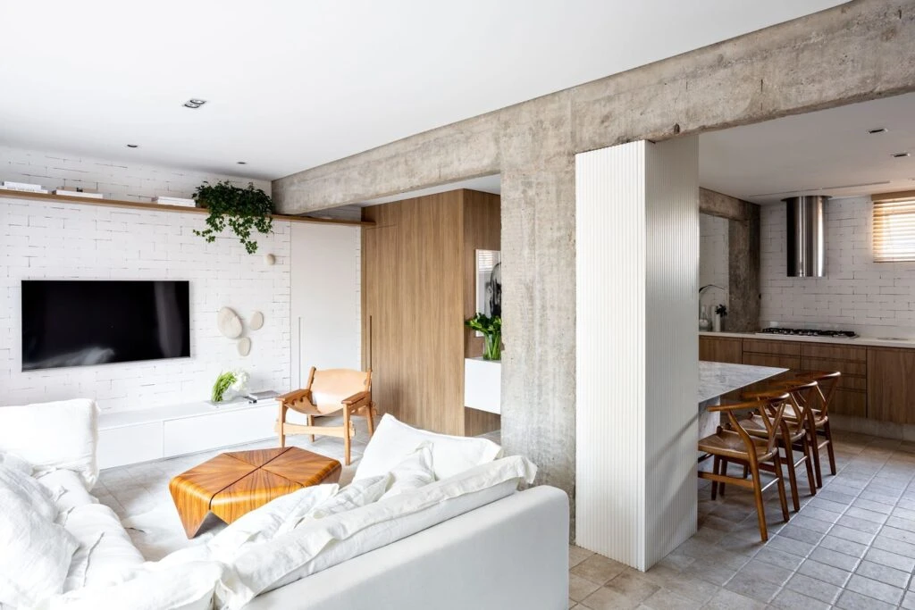 La solución fue dejar a la vista la estructura original de hormigón, así como también el conjunto de vigas que dibujan el revestimiento del área social.