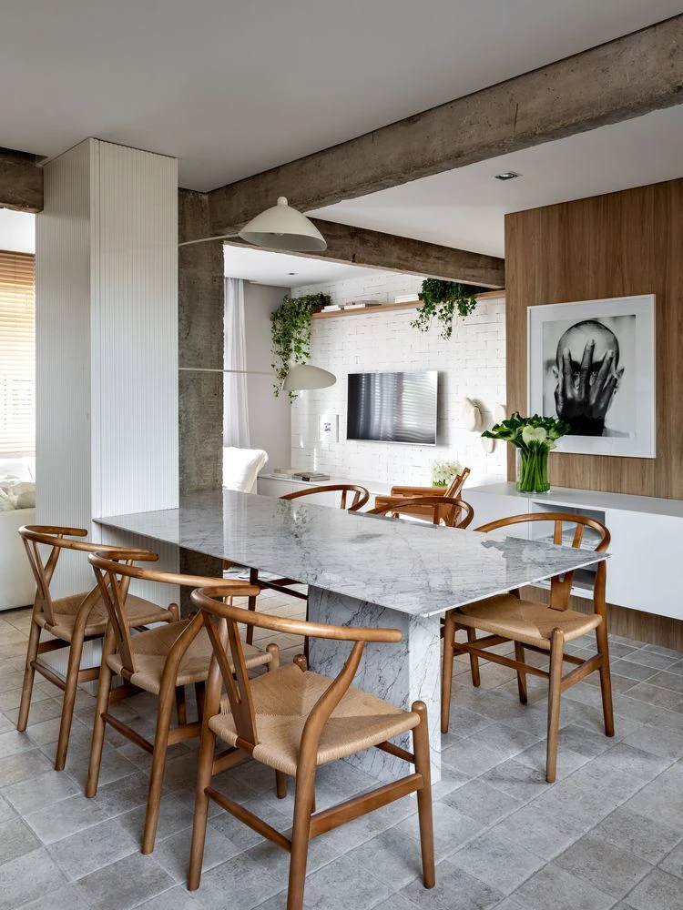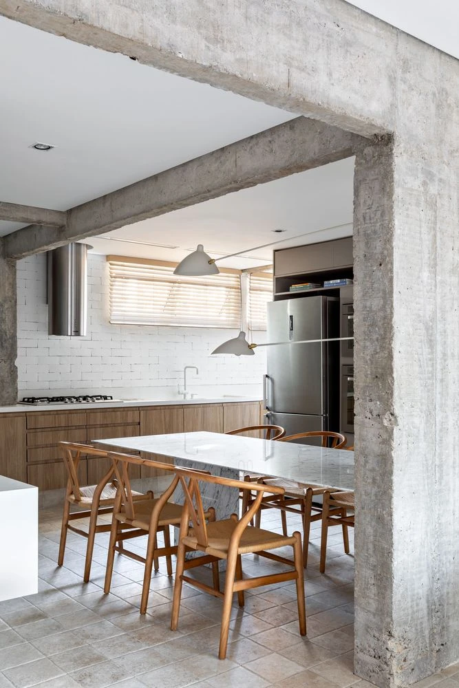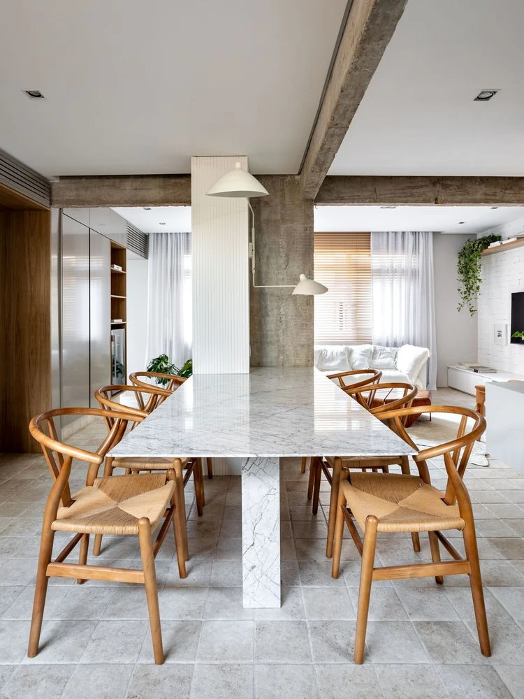 El concepto de una isla o cocina americana dio paso a la mesa de comedor en mármol de carrara, que va en línea con la columna de hormigón visto. Justo delante, un largo mesón en Caesarstone sirve de apoyo a toda esta región.
