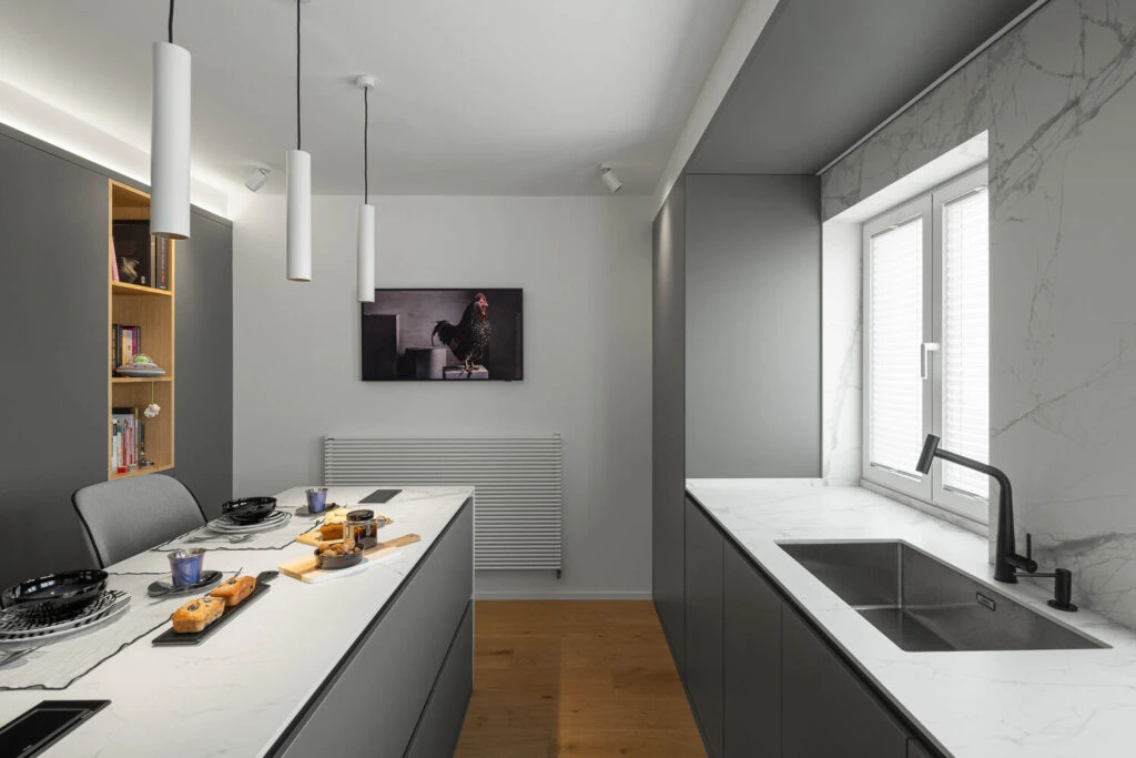 También un dormitorio con vestidor y baño; y una cocina con mucho almacenaje con zona informal para comer. Todo eso unido visualmente con el living y mesa de juegos.