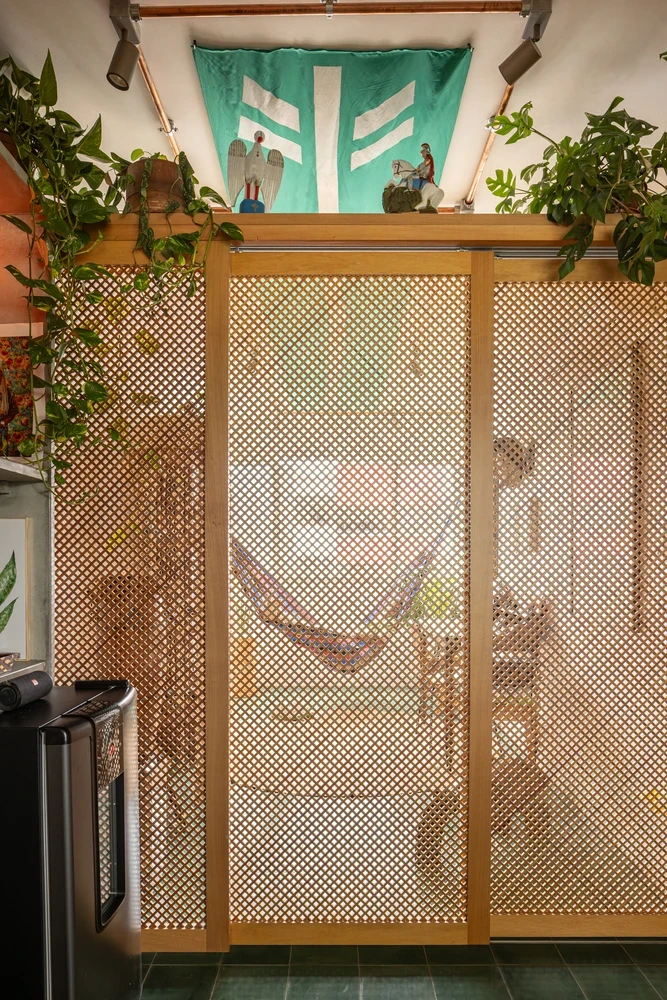 La cocina se abre al living, la oficina también, y todo fluye sin interrupciones. Pero si necesitás privacidad, el depto tiene un as bajo la manga: paneles de madera perforada tipo mashrabiya que permiten cerrar el dormitorio o el escritorio sin perder luz ni ventilación. Pura magia funcional.