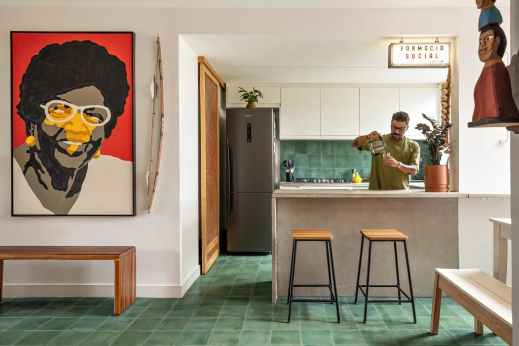 Cada material fue elegido con pinzas para lograr coherencia y estilo. Las baldosas hidráulicas verde oscuro en todo el piso unifican los ambientes y le suman carácter.