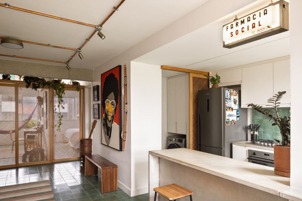 Uno de los detalles más interesantes es la posibilidad de cerrar el dormitorio y la oficina con un panel de madera perforado tipo mashrabiya. ¿El resultado? Privacidad sin sacrificar la luz natural ni la ventilación, una solución que también se aplicó en la zona de servicio.