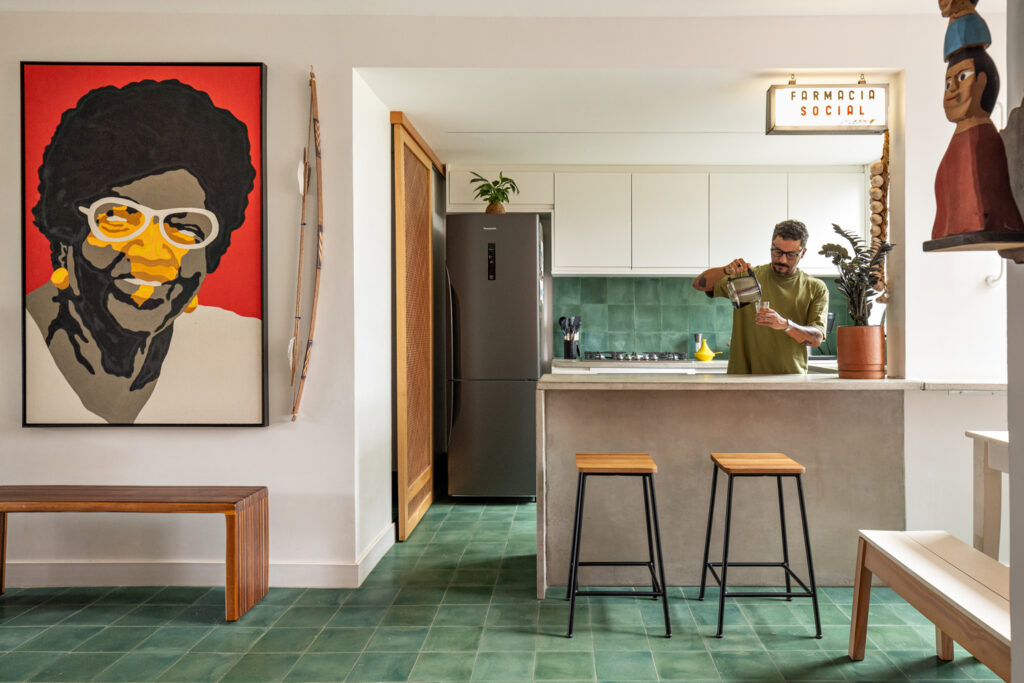 Cada elección de material se hizo con precisión para garantizar armonía y funcionalidad. El piso de todo el departamento se revistió con baldosas hidráulicas en un tono verde oscuro, aportando carácter y uniendo visualmente todos los espacios.