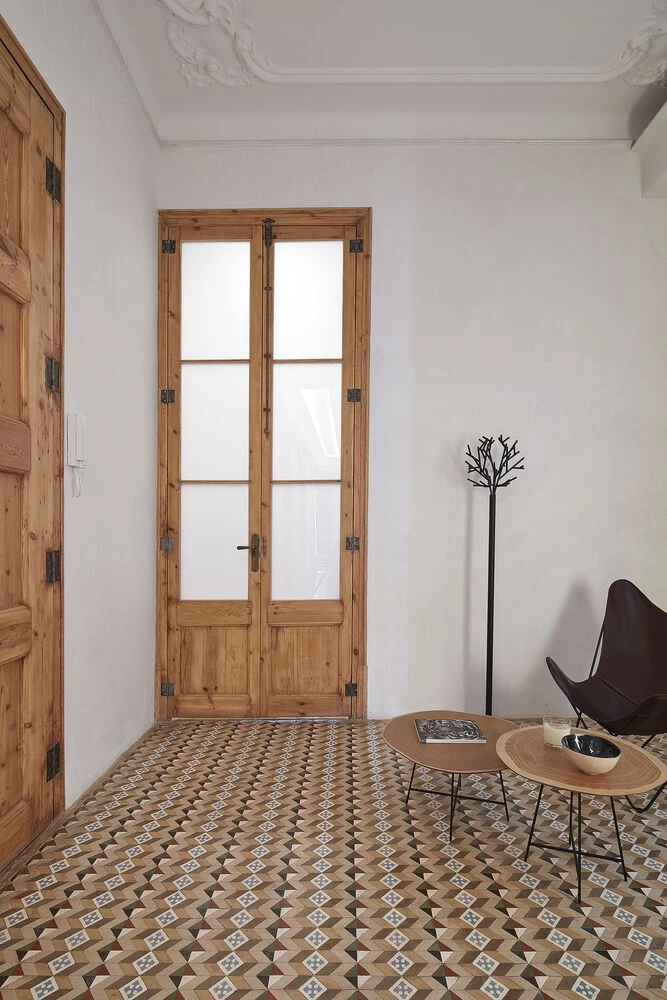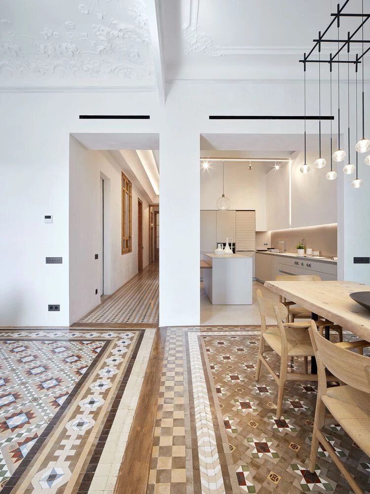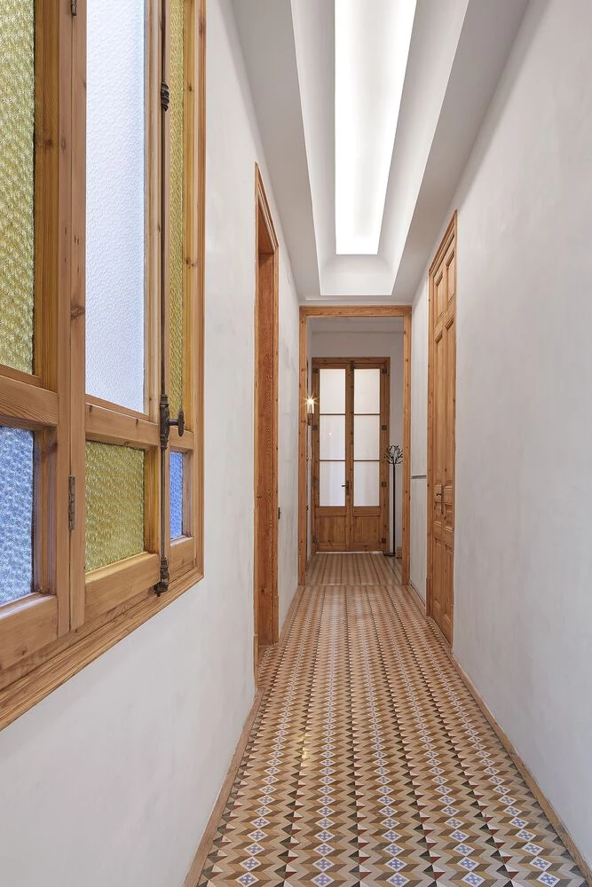 El recibidor, espacio generoso típico de los pisos del Ensanche Barcelonesa de principio del siglo XX, proyecta en el pasillo un eje de 20 mts de longitud que comunica todos los ambientes de la casa.