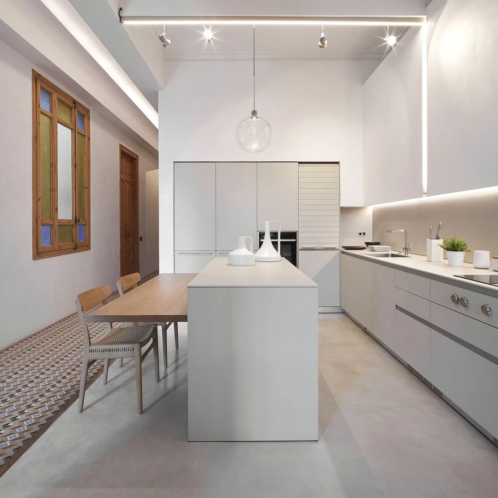 Por esta razón se proyectó una cornisa abierta que deja la visión del techo original y al mismo tiempo esconde los conductos de climatización (aerotermia) y las bandejas que soportan las instalaciones eléctricas y de agua. Se aprovecha este vacío de la nueva cornisa para colocar la iluminación indirecta de los espacios de distribución.
