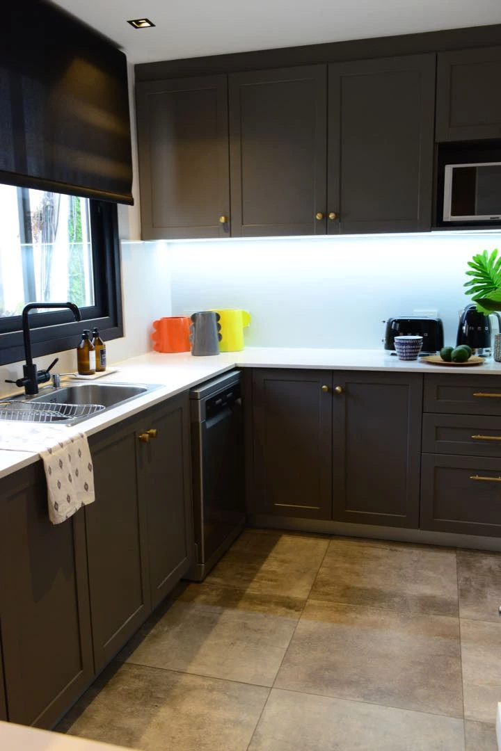 Una imagen de la cocina. Lámpara colgante (San Isidro Luz). Platos pintados a mano (Good Luck Casa).