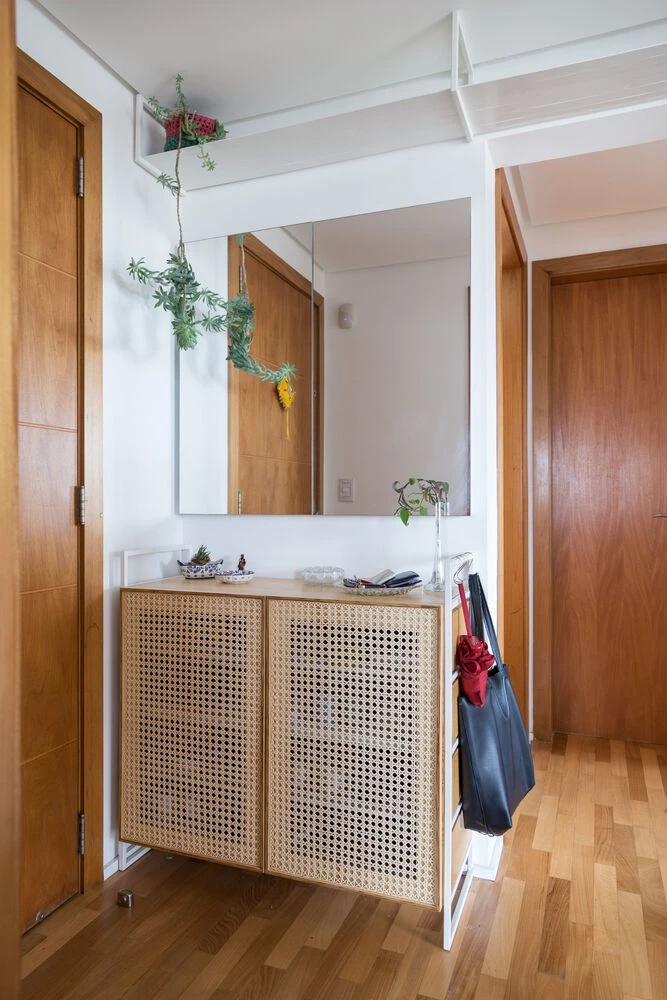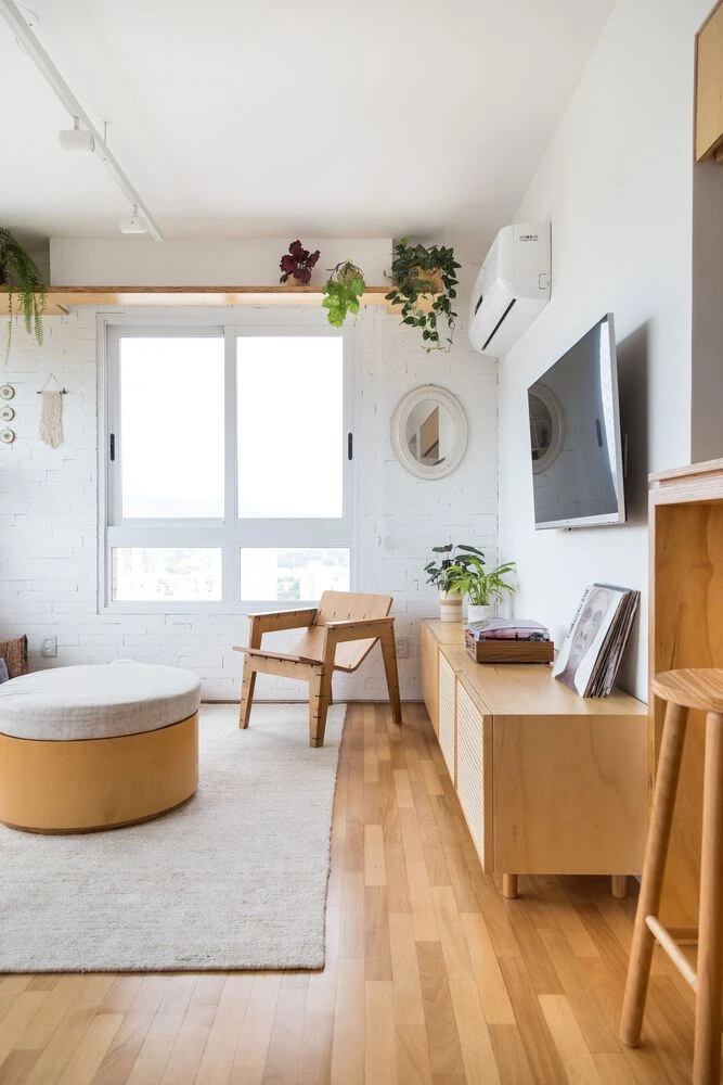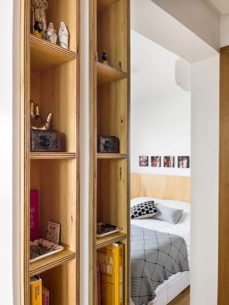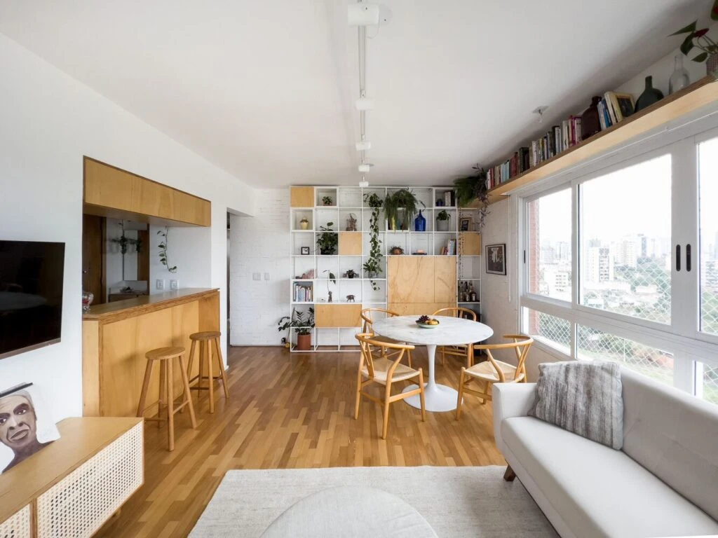 El departamento se compró con techo de yeso y suelo de porcelanato pulido. El suelo frío se sustituyó por parqué de madera tauari y se retiró el yeso. Los muebles fueron diseñados en blanco y contrachapado naval. Estos materiales crearon un ambiente equilibrado y acogedor.