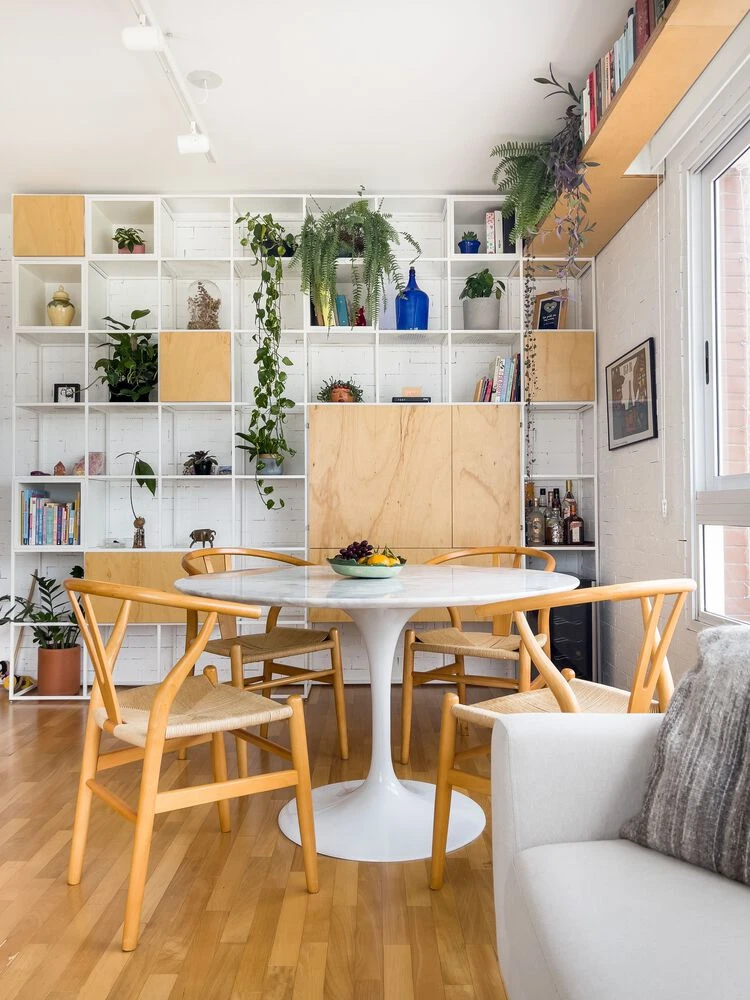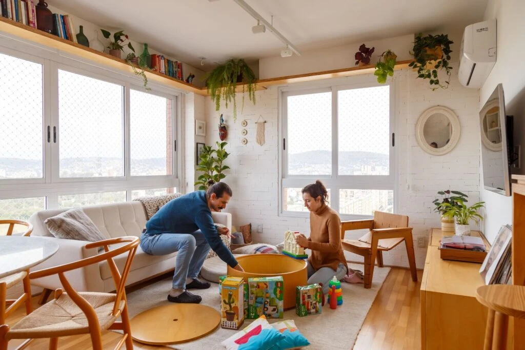 Estanterías cerca de la ventana alojan libros y plantas, trayendo el verde de afuera hacia el interior. La mesa ratona también es un baúl para juguetes.