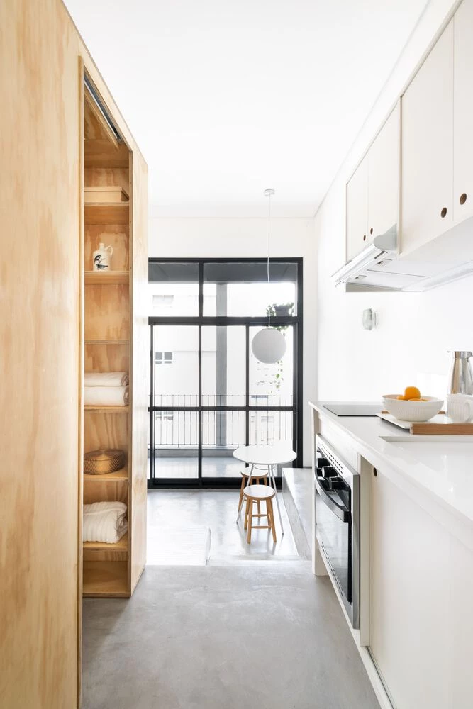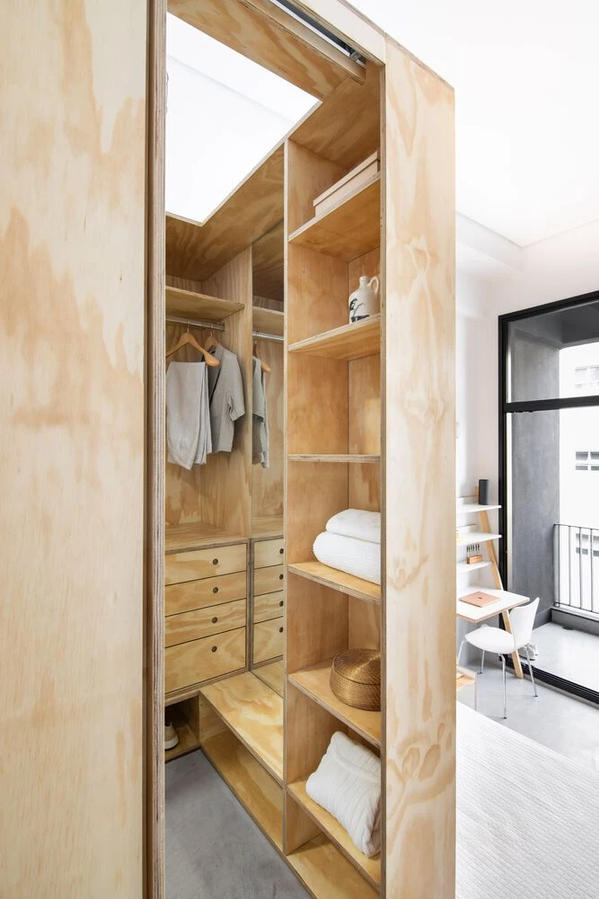 Los espacios de guardado fueron pensados para tener varias funciones. Por fuera, cuando se ingresa al departamento, sirve para dejar los zapatos o como despensa de cocina. Próximo a la cama, sirve de mesita de noche. Adentro, a pesar de ser pequeño, es bien completo con cajoneras, percheros y un espejo que está frente a la salida del baño, aportando más comodidad a la hora de cambiarse de ropa.