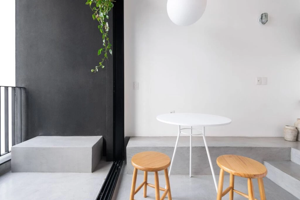 En el piso inferior se eliminó la escalera metálica preexistente y se creó una nueva de mampostería, que se despliega en un banco continuo hasta el balcón. Esto permite que la compacta mesa para comer sea usada tanto en el ambiente interno como externo.