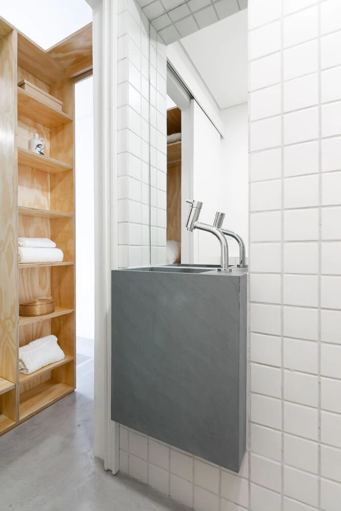 También se aprovechó cada centímetro desde el piso de entrada al departamento, donde está la cocina y el baño. Se eliminó la bacha que estaba afuera del baño y se creó un espacio adentro para encajar ahí un lavabo tallado de diseño.