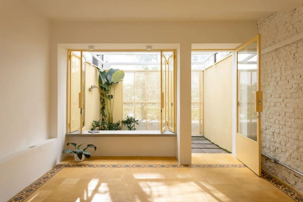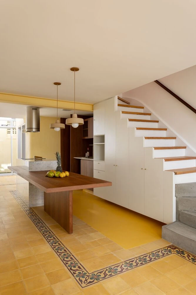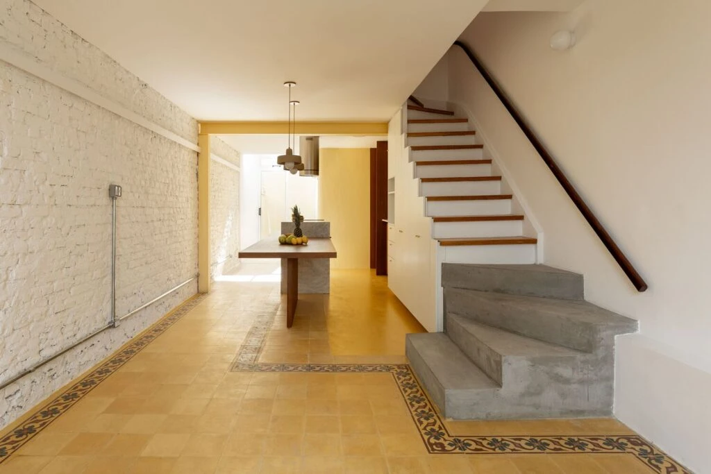 Este objetivo se materializó en varias elecciones, destacando el piso de ladrillo hidráulico amarillo original, enmarcado por una franja del mismo material que recorre casi todo el perímetro.