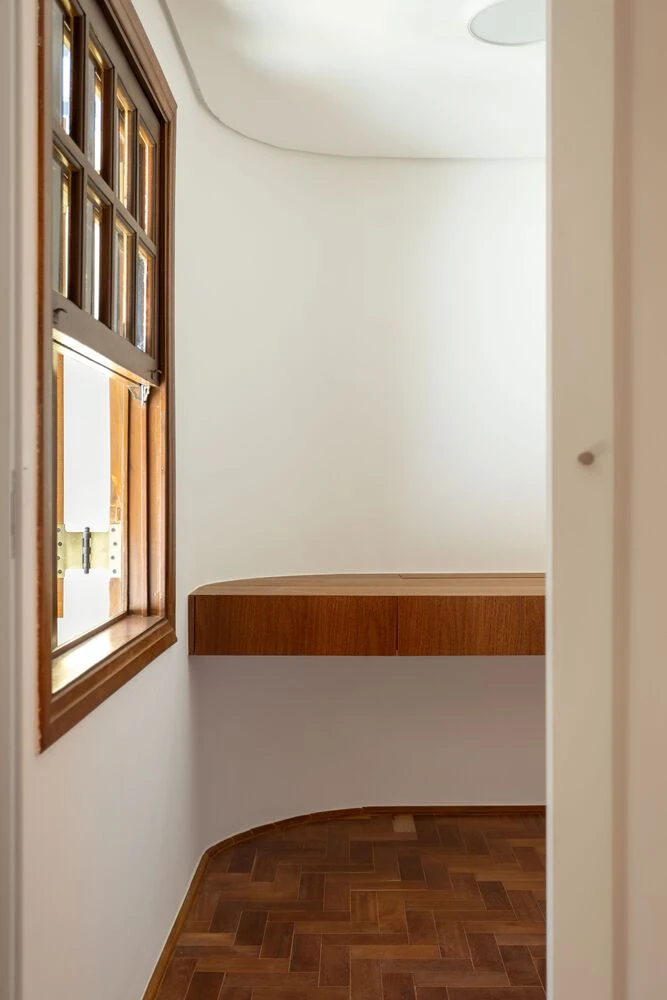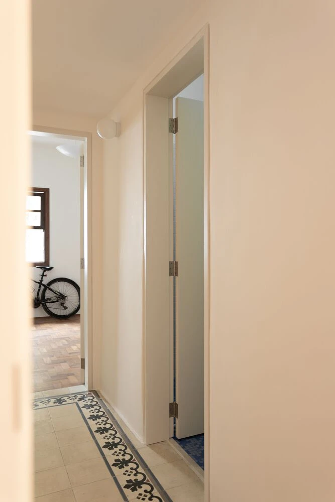En el piso superior el diseño fue preservado y los pisos de madera de las habitaciones y ladrillo hidráulico de la circulación fueron mantenidos.