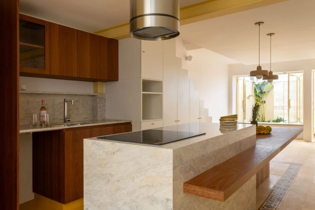Una isla de mármol está ubicada en el centro del área de la cocina y, al entenderse también como área social, se conecta al comedor a través de una barra en carpintería.