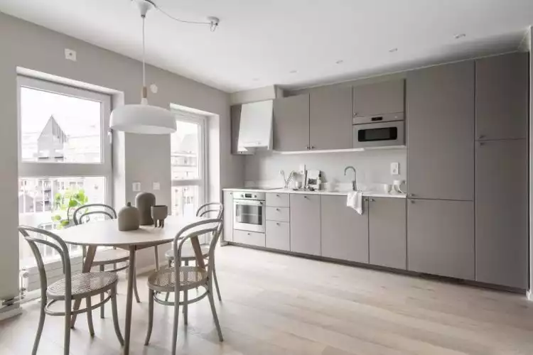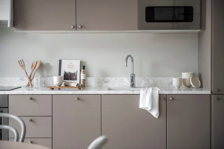 La cocina se desarrolla de forma lineal con muebles y alacenas en un mismo color cálido. La heladera se encuentra oculta para darle un toque aún más minimalista.