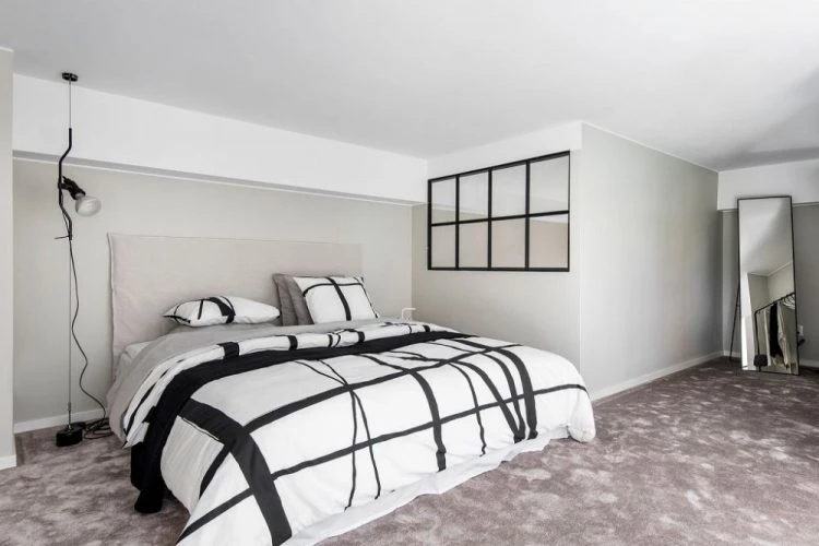 La decoración de la habitación es muy básica. Sólo cuenta con un espejo y una lámpara de pie. El respaldo también es simple y combina en armonía con el resto del ambiente. A diferencia de la planta baja, es el color negro es el que predomina en pequeños detalles.