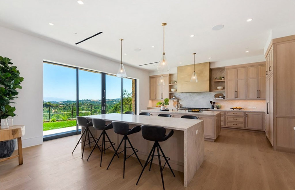 La cocina es un lujo. Está equipada con alacenas de madera clara, mesadas de mármol, dos islas amplias (una funciona como barra desayunadora y otra para almacenar diferentes utensilios) y electrodomésticos de alta gama. Los amplios ventanales también se hacen presentes en este sector privilegiado de la casa y permiten una conexión directa con los exteriores repletos de vegetación.