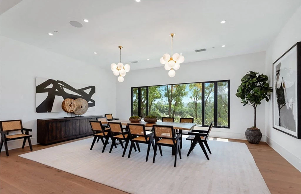 El comedor principal se destaca por seguir un estilo de decoración clásico pero con guiños retro. La mesa cuenta con una estructura de hierro y tapa de madera clara además de espacio para 12 comensales gracias a las sillas tipo cannage. Dos lámparas de diseño sobrevuelan sobre este sector y, junto con los detalles deco como cuadros y una ficus pandurata, le dan el cierre perfecto.