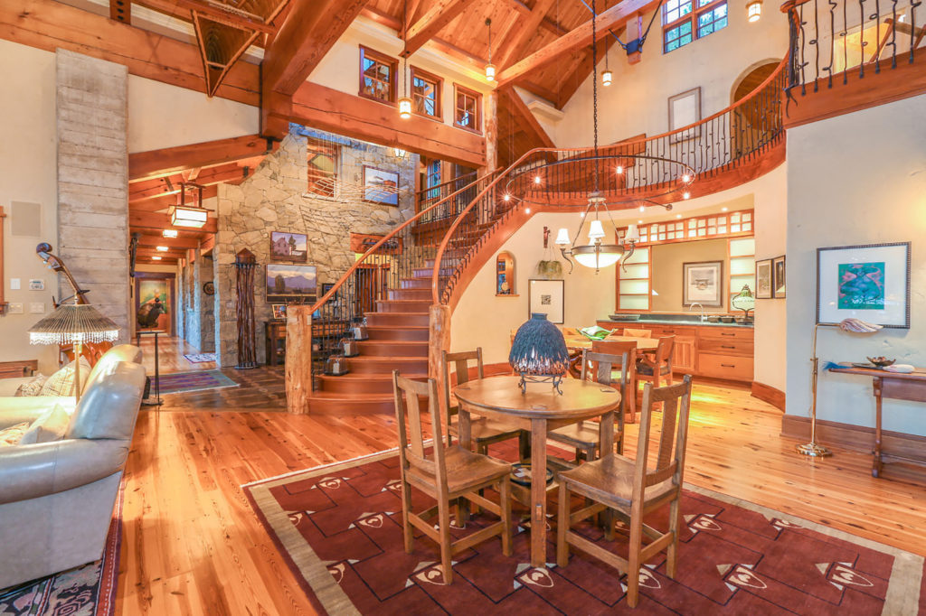 Cuenta con un espacio destinado al relax con cómodos sillones rodeando una chimenea de piedra, una pequeña mesa redonda con cuatro sillas y a su lado, se encuentra una mesa de mayor tamaño que funciona como comedor principal con espacio para seis comensales.