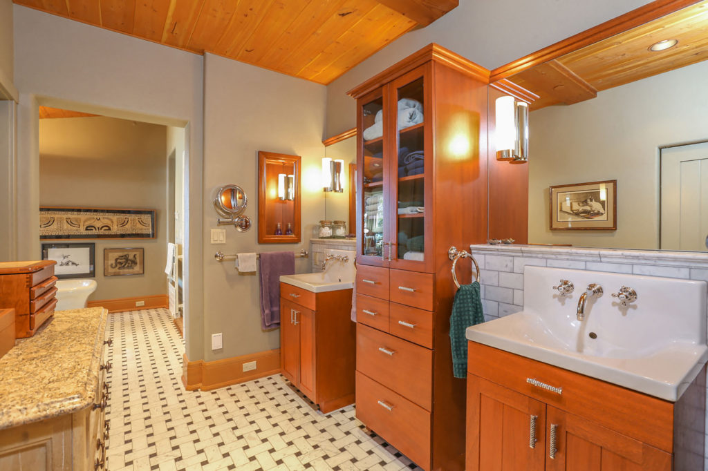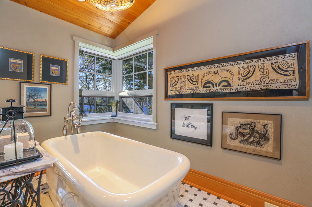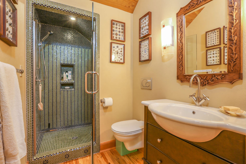 Los baños de la mansión siguen una decoración muy original que va a tono con el resto de los ambientes. Todos cuentan con bañera y ducha a vapor.