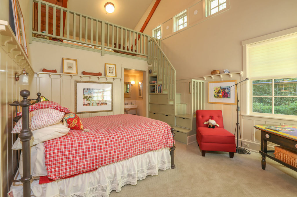Los dormitorios principales se encuentran en la planta alta. Por un lado el matrimonial, sigue un estilo decorativo similar al que predomina en el resto de los ambientes con la madera como protagonista y los colores cálidos. En el dormitorio infantil, en cambio, el blanco toma el protagonismo, así como también otros colores vibrantes como el rojo y sigue un estilo decorativo romántico.