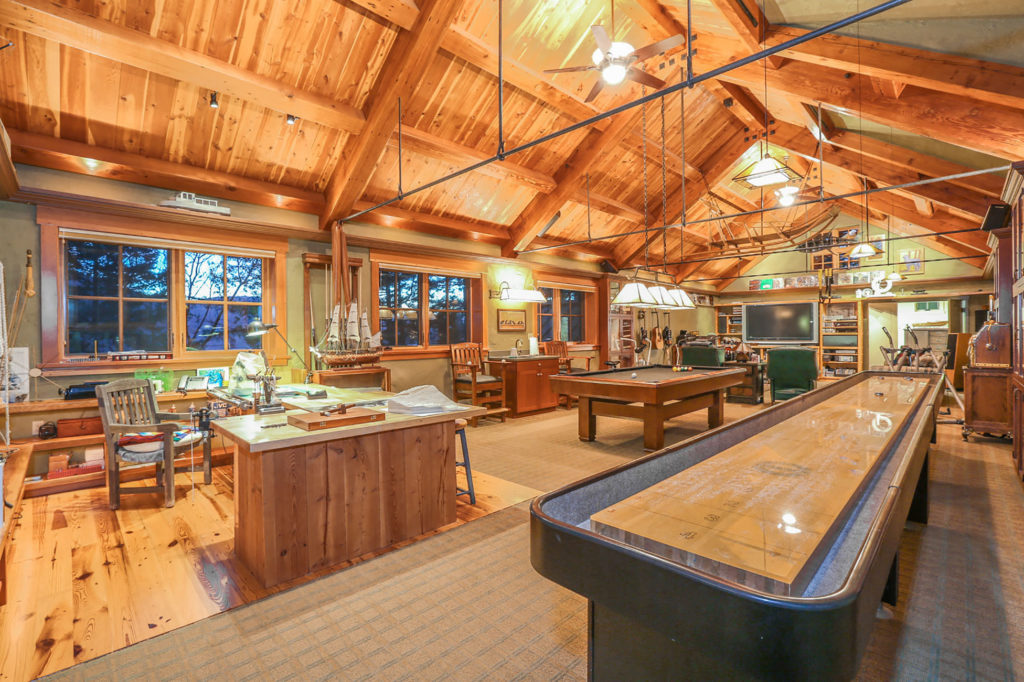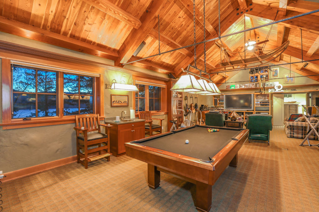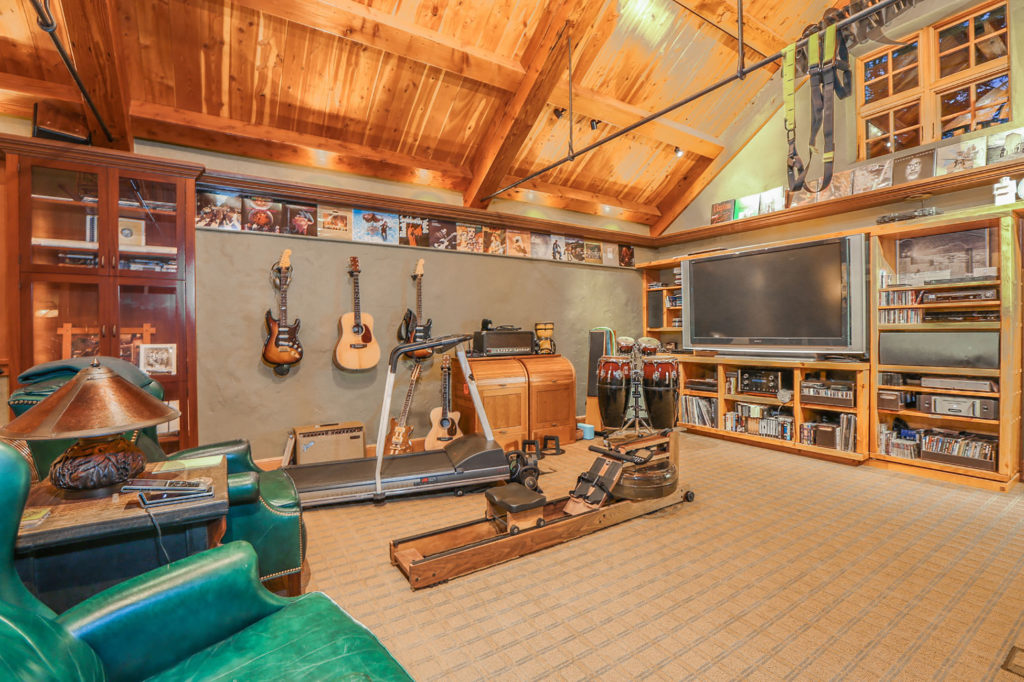 Una amplia y cálida sala de entretenimiento con techos súper altos, cuenta con todas las comodidades (y lujos). Máquinas para hacer gimnasia, instrumentos musicales y hasta un pool.
