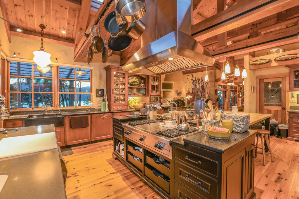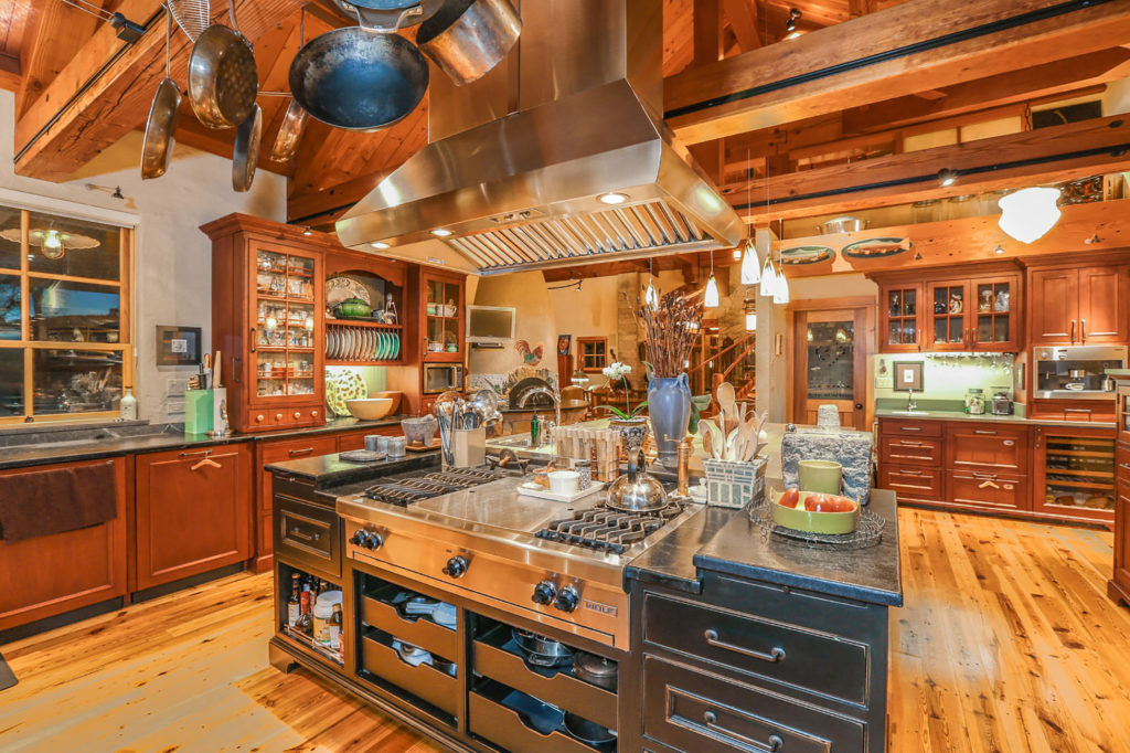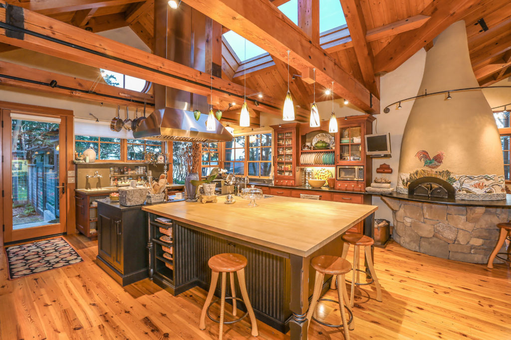 La cocina es uno de los espacios más privilegiados de la lujosa mansión. Cuenta con un horno pizzero a leña, electrodomésticos de primera categoría y una súper isla en el medio que también cumple con la función de barra desayunadora.