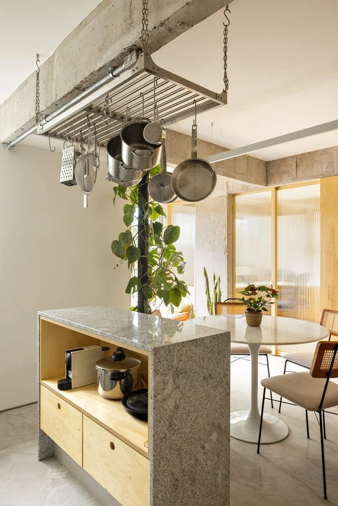 Todo el departamento está pensado para fluir. Las carpinterías de contrachapado son el alma de la organización, separando ambientes mientras ofrecen almacenamiento práctico.