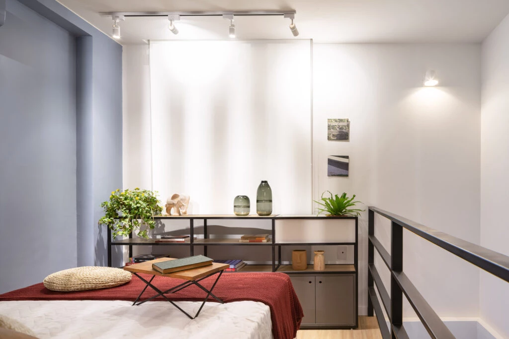 De esta forma, la planta superior, ahora con doble espacio, asigna la parte privada del departamento, con dormitorio, home office, closet y baño.