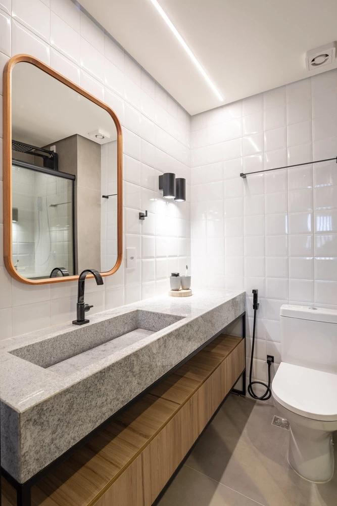 En el baño principal se sustituyó la pared por un panel de vidrio con marco de aluminio negro, realzando el espacio interior y la iluminación. Se revistió la zona seca con azulejos blancos y las paredes de la ducha con porcelánico gris oscuro, creando otro contraste de luz y color. La mesada con fregadero de granito blanco tallado se apoya en un mueble metálico negro.