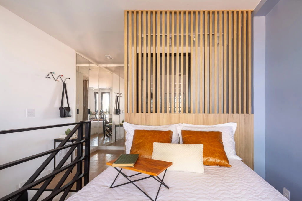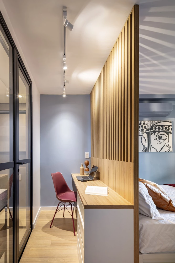 En el dormitorio se creó un panel transparente de madera para dividir la habitación con un espacio de oficina en casa, evitando una barrera visual pesada.
