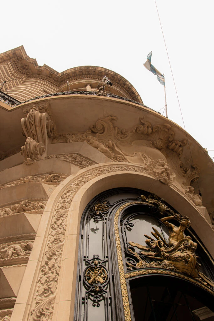 Es sólida, simétrica y cargada de simbolismo naval: columnas monumentales, buhardillas, balcones corridos y la figura de Tritón coronando la puerta, obra del escultor Luigi Trinchero, que también participó del Teatro Colón.