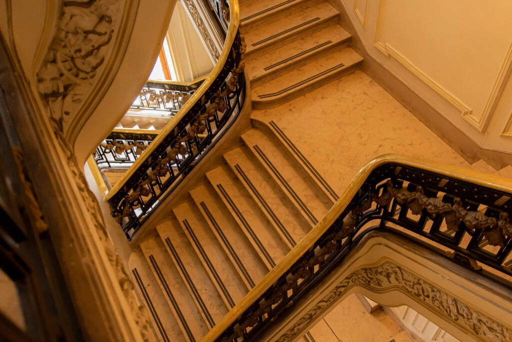 El interior no se queda atrás: un hall imponente, una escalera imperial de mármol blanco, una farola majestuosa y detalles náuticos en cada rincón.