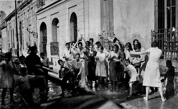 Ya en los dorados años veinte, el festejo se extendía entre funcionarios públicos. No se salvaban ni autoridades policiales ni sacerdotes de ser mojados con los pomos de agua.