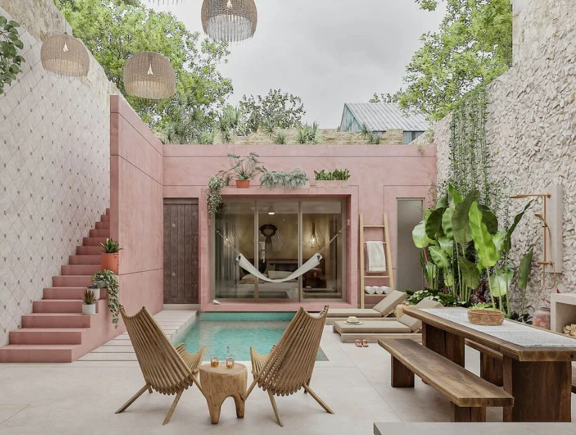 El nombre "Casa Kancab" deriva del término maya que significa "Tierra Roja", inspirado en los vibrantes tonos rojos elegidos para contrastar con los tonos neutros del acabado de chukum, mejorando así la profundidad visual y el carácter en el diseño interior.