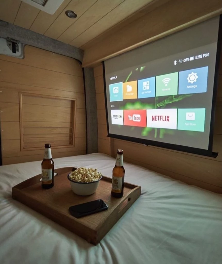 Esta casa rodante, está completamente equipada con una cama king size, baño con ducha y agua caliente, calefacción, frigobar, dos kayac y hasta un proyector perfecto para ver películas por las noches o cuando el clima lo amerita.