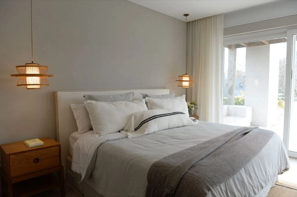 Colores claros para esta suite fresca y luminosa. Las paredes pintadas de un gris muy sutil le dan un buen marco al respaldo entelado, la ropa de cama (Angelina Linen) y las mesas de luz de petiribí (Bull Bs As) sobre las que caen unos apliques de techo (Mejía Mangudo). Alfombra de fibras naturales (Akelik) y cortinas de lino (The linen store).