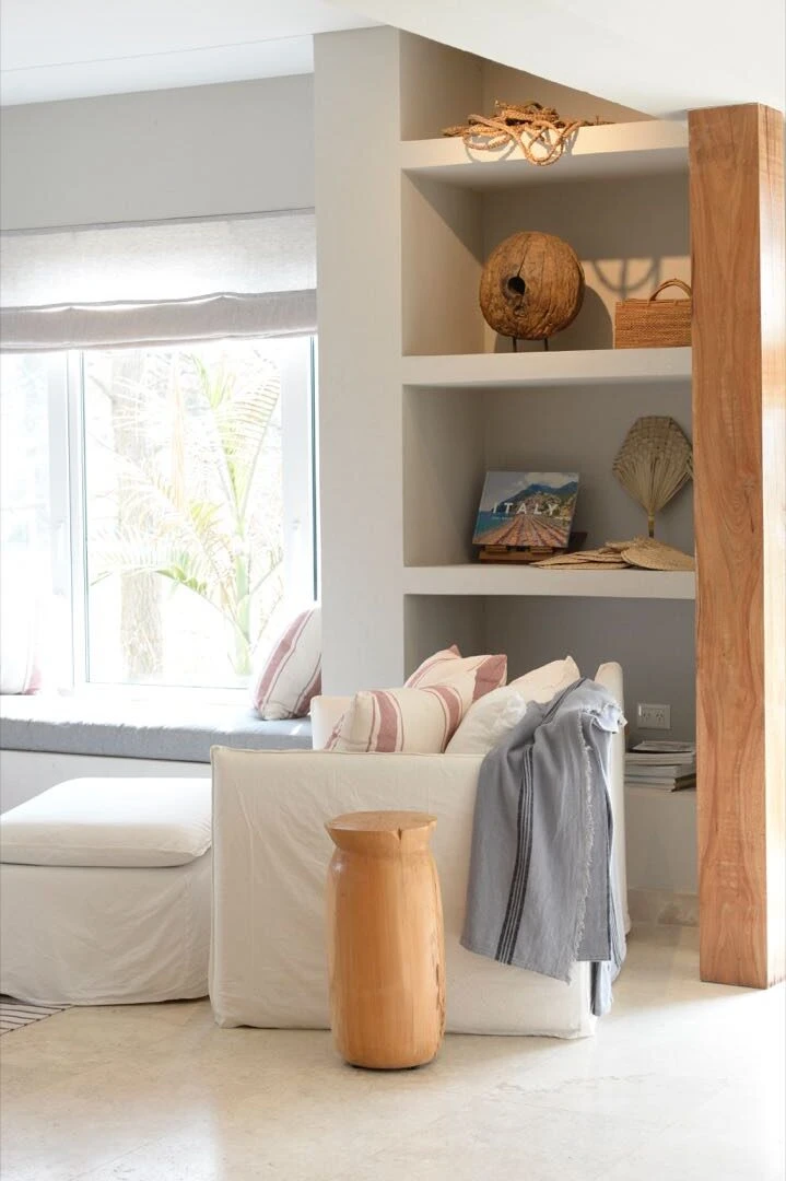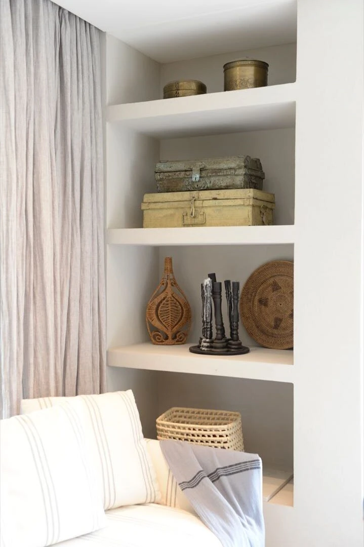 Una biblioteca de mampostería reúne objetos traídos de viajes. La paleta de tonos claros (constante en toda la casa) se hace presente en los tapizados de los sillones y almohadones (diseño del estudio Larralde Spelzini).