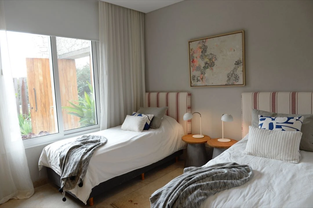 Los dormitorios para los hijos y los invitados se resolvieron con un mismo criterio de diseño. En el dormitorio para tres: camas de madera (Mesopotamia) con lámparas pinza sobre el respaldo (Si luz), ropa de cama (Angelina Linen) y mantas (Ikea). Alfombra a rayas (Sentido) y cuadros (Estudio Polonia). Cortinas de lino (The linen Store). En el cuarto de huéspedes, dos camas con respaldos entelados a rayas (diseño del estudio), mesas de luz de cemento y madera (Coin Vert), alfombra (Kasbah) y un cuadro (Elena Clement).