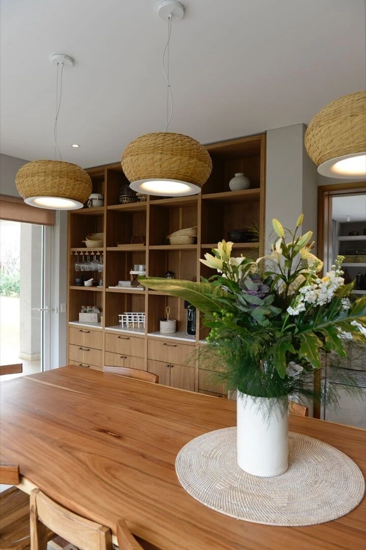 A falta de un comedor formal, la idea de los dueños de casa fue que la cocina tuviera una mesa protagonista. Y vaya si lo lograron con este gran mesón de 4,20 metros de largo x 1,20 m de ancho. Está diseñado en madera de incienso tanto en la tapa como en las patas (estudio Larralde & Spelzini) y encuentra una compañía informal en el juego de dos tipos de sillas, en madera de petiribí macizas y con asientos tejidos (todo diseño del estudio).