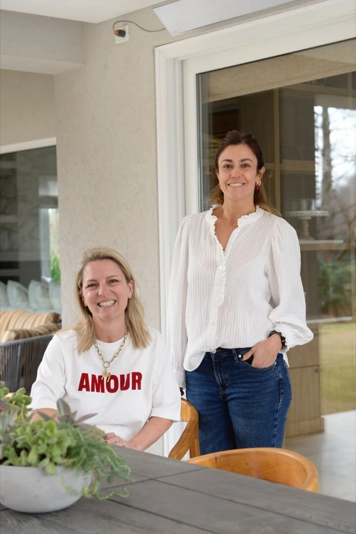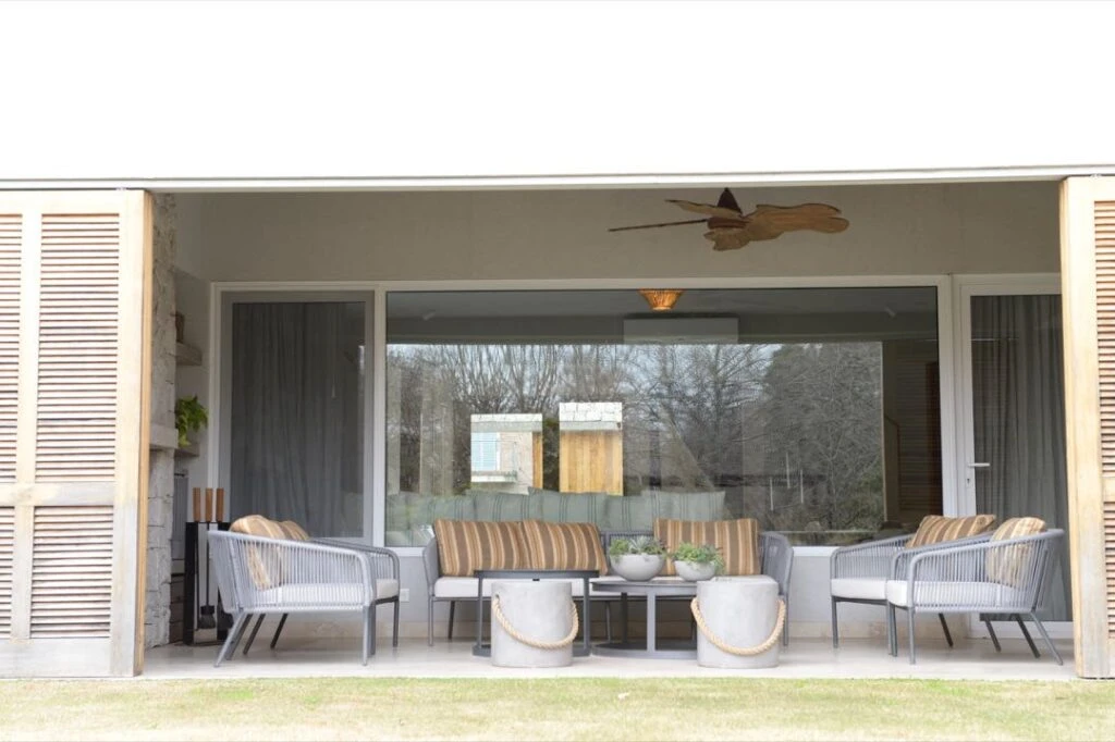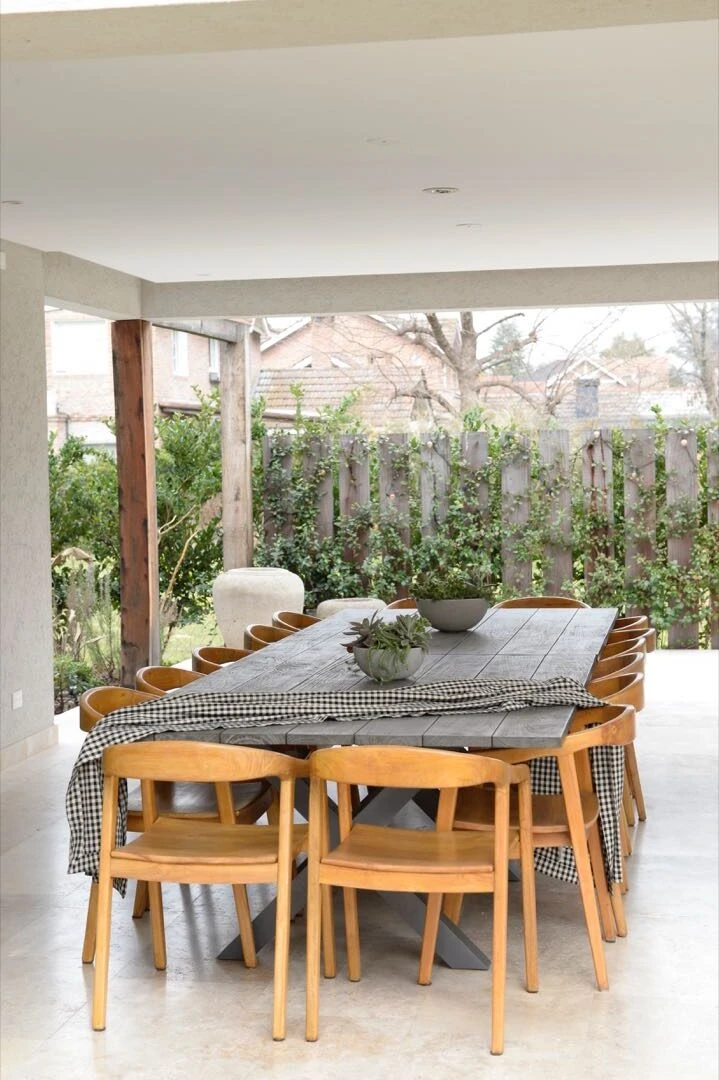 En el comedor de exteriores, mesa de madera con patas en cruz de aluminio (Coin Vert), sillas y tinajas de piedra como centro de mesa (Mirador por el mundo). El material que más se destaca en la propuesta es el travertino, presente en todos los pisos (incluso en galería y en pileta). Las maderas son de incenso o petiribí y todas las paredes se trataron con Tarquini, tanto en interiores como en exteriores, combinadas en algunos casos con piedra Voladura.