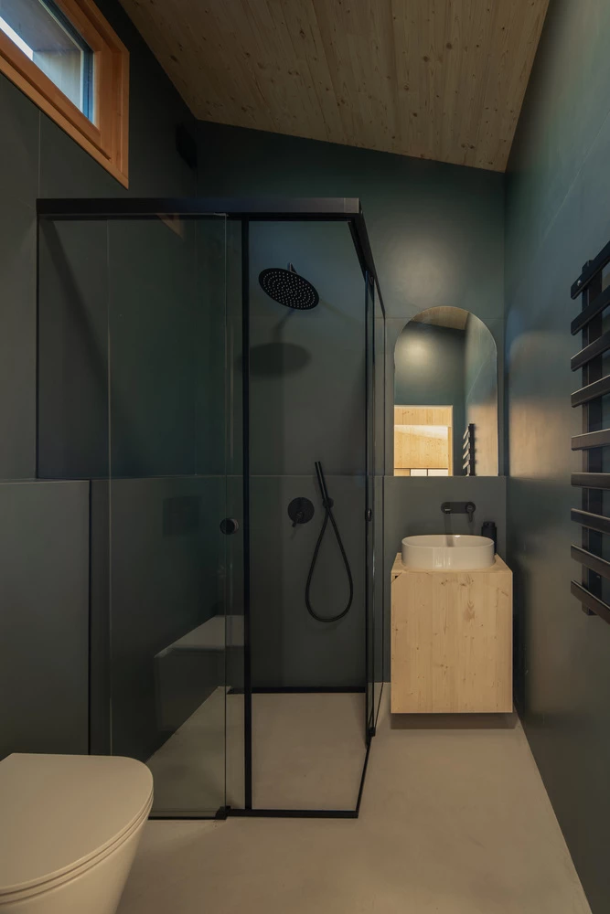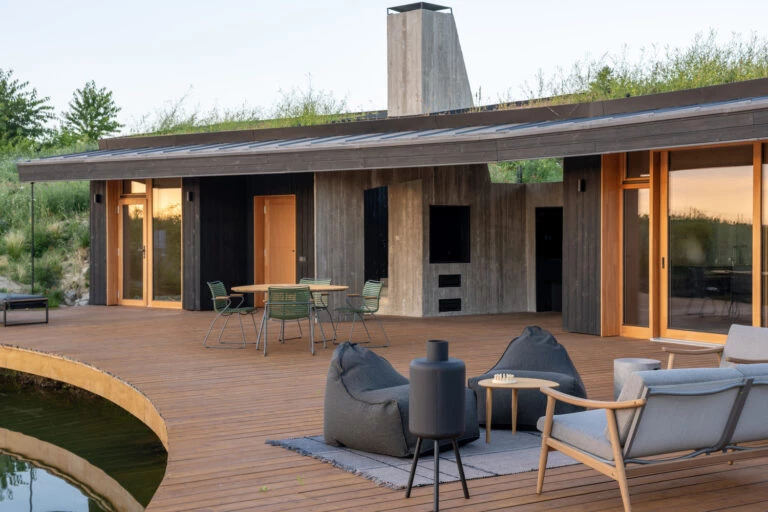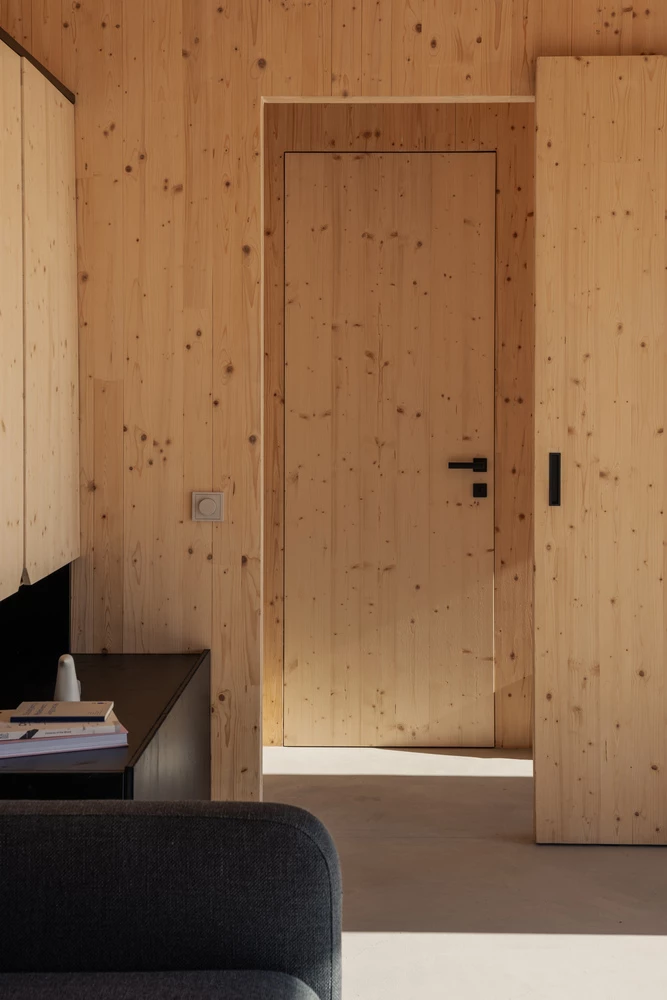 El meticuloso detalle que el estudio Hello Wood puso en cada centímetro es evidente. El hormigón, moldeado con restos de madera, lleva la textura de las vigas. Las enormes ventanas y puertas de vidrio se abren de par en par al mundo exterior, atrayendo la luz y la vida.