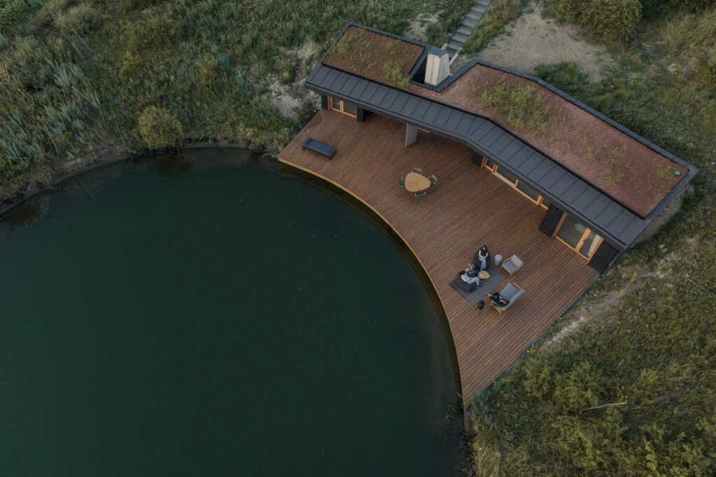 Pero no es sólo una casa... es una declaración, un santuario, un susurro en el bosque que dice mucho sobre diseño y armonía, ya que está excavada en una loma, asomándose lo justo como para confundirse con el horizonte.