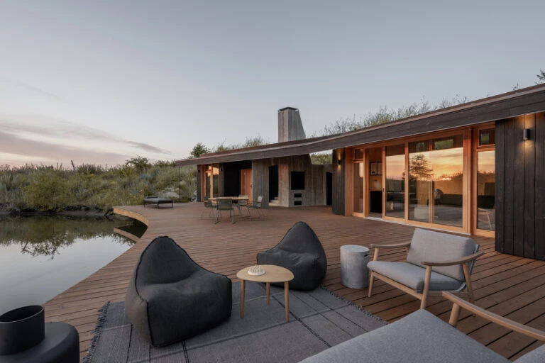 La casa se extiende con una galería de 135 m2 que bordea el agua, haciendo de los suelos de madera el mejor lugar para disfrutar de cada amanecer y atardecer.