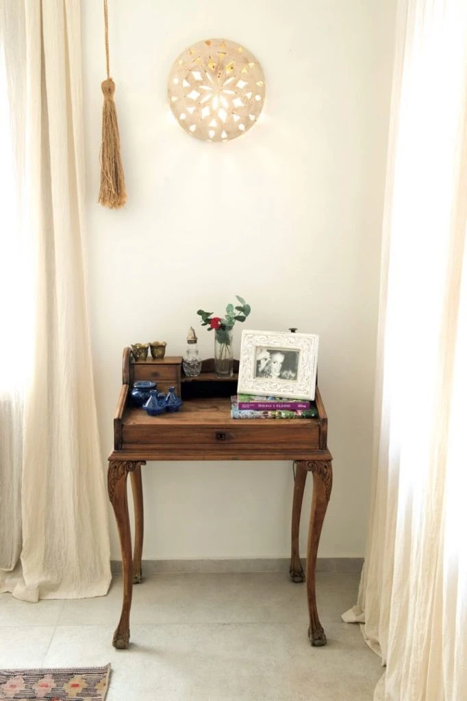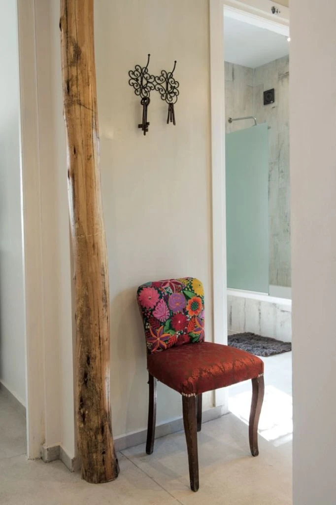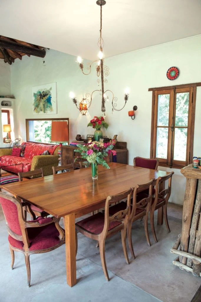 La mesa fija de madera fue hecha por un carpintero de la casa. El techo tiene tirantes de madera le da sostén a unas lámparas muy particulares, hechas con macetas blancas y doradas de los años 70, que fueron pintadas en color óxido. Como revestimiento del piso, calcáreos de colores tierra y mar en damero.