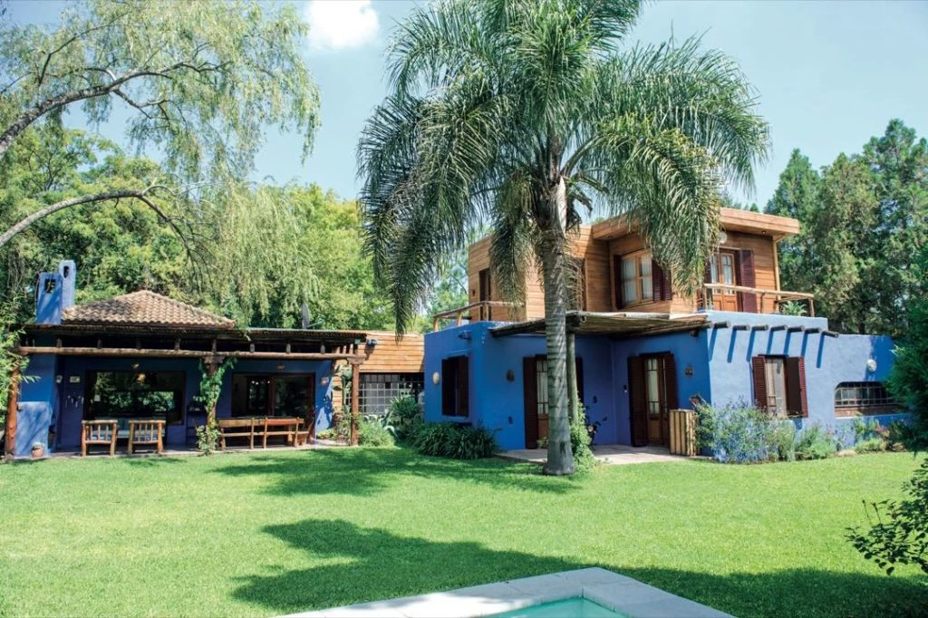 Todo el exterior de la casa es de un azul añil, inspirado en el color del mar. Palmeras y una arboleda añeja custodian el terreno.