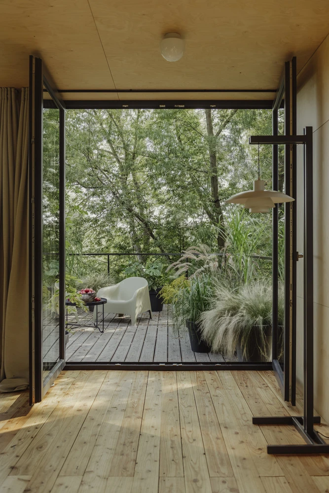 Las paredes están aisladas con espuma en aerosol y acabadas con madera contrachapada de abedul, lo que brinda una atmósfera muy cálida al interior.