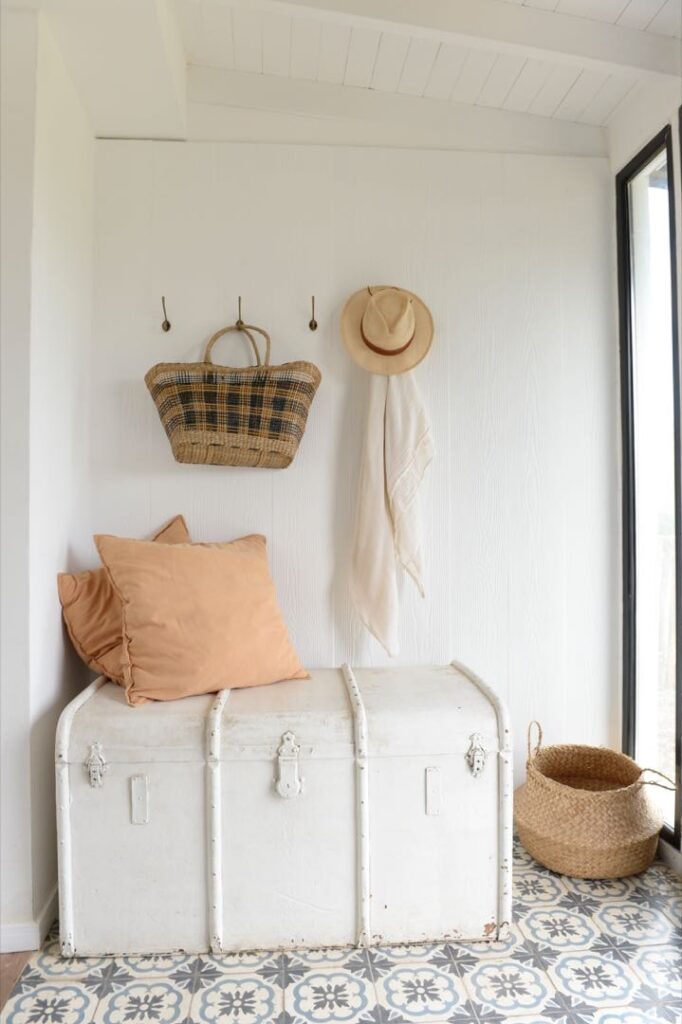 El cuarto de Pipe, el hijo de Lucila, tiene sus paredes forradas con placas de MDF blanco a media altura y un suave tono de verde para el resto. Como ropa de cama, funda de edredón (@melonargentina) y manta y almohadón (@eltalleras). Uno de sus lugares favoritos para jugar es la carpita (@pastichedelau). Alfombra en color claro (@seara.alfombras) y baúl de junco (@decojoaquina).