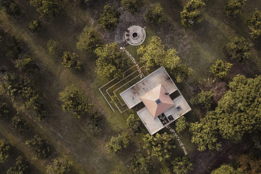 Con un techo piramidal y espacios concéntricos a éste, el diseño interior de la casa se basa en de colores y materialidades sencillas que aportan sobriedad y personalidad.