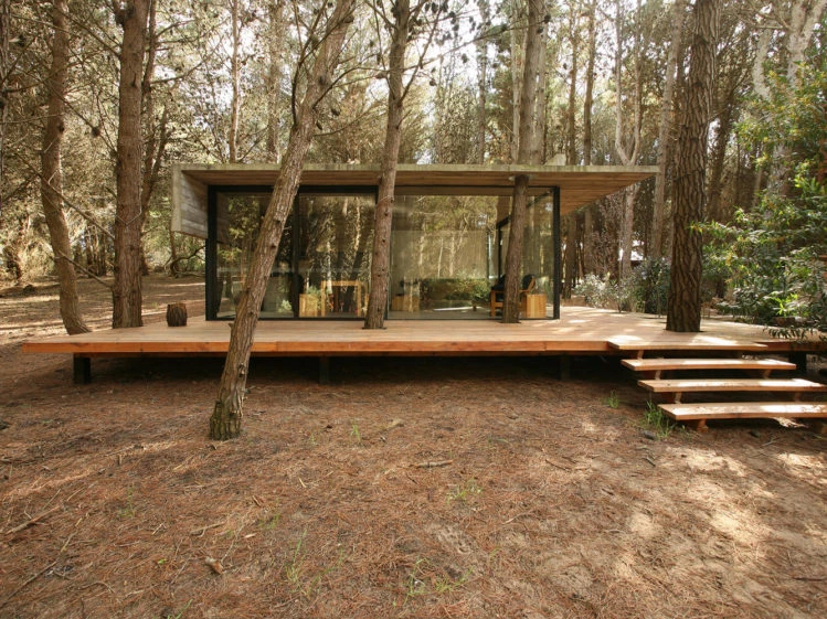 La búsqueda de alternativas tendría tres únicas limitaciones: que la obra fuera de muy bajo impacto en ese paisaje, que se ajustarse a un bajo presupuesto y que su mantenimiento posterior fuera casi nulo. Con estas premisas, la casa ubicada en un terreno con 43 pinos y de suave pendiente hacia la calle, fue resuelta como un rotundo prisma, exento, de altura mínima, definido por una envolvente de hormigón a la vista, de textura y color en armonía con el bosque, y grandes paños de vidrio que permitan una total integración con el paisaje y que a la vez lo reflejen. Las funciones complementarias (baño auxiliar, depósito y tanque de agua) se reunieron en un prisma vertical de madera escondido entre los árboles.
